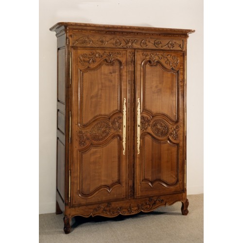 Entièrement massive. Merisier et bois divers feuillus de France. Mouluration en élégie. Sculpture à la main.