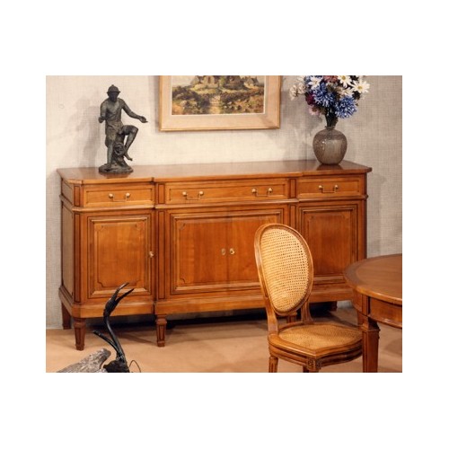 Ce bahut est à corps avancé. En partie centrale on a une double porte (apparence d'une porte unique en réalité coupée en son milieu ) et un seul tiroir. De chaque côté on a 1 porte et 1 tiroir.